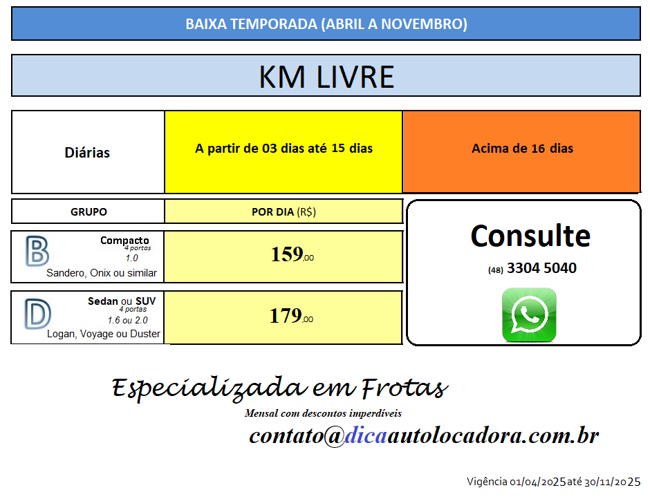 apenas a opção de KM LIVRE! Igual ou acima de 30 dias tem limite de Km, consulte os pacotes!